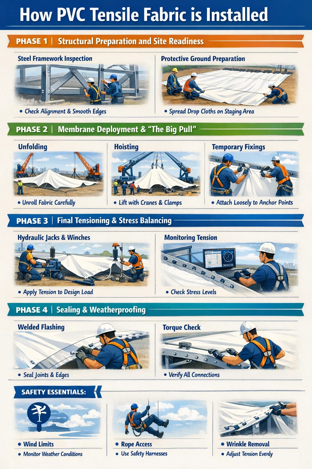 Installation Tissu extensible en PVC est un processus conçu avec précision qui transforme une membrane flexible en un toit structurel rigide. Contrairement aux toitures traditionnelles, l'installation repose sur tension artificielle plutôt que de masse. Le processus commence par l'érection d'une structure de support primaire en acier ou en bois, suivie du déroulement minutieux de la toile, de la fixation aux fixations périmétriques et d'une phase de « tension » systématique au cours de laquelle le matériau est tiré jusqu'à sa contrainte de conception calculée pour assurer la résistance aux charges de vent et de neige.