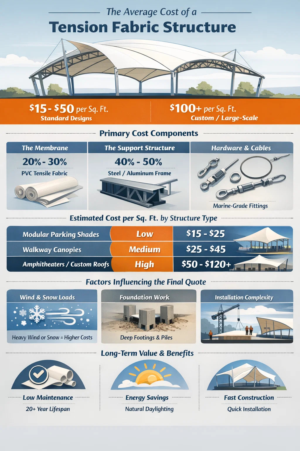 Comprendre où va votre argent nécessite de décomposer le projet en ses parties physiques. Une structure en tension est une synergie d'éléments flexibles et rigides.