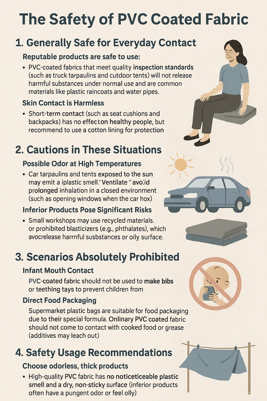 Les produits réputés sont sûrs à utiliser : Tissus enduits de PVC qui répondent aux normes d'inspection de qualité (telles que les bâches de camion et les tentes extérieures) ne dégageront pas de substances nocives dans des conditions normales d'utilisation et sont des matériaux courants comme les imperméables en plastique et les conduites d'eau.