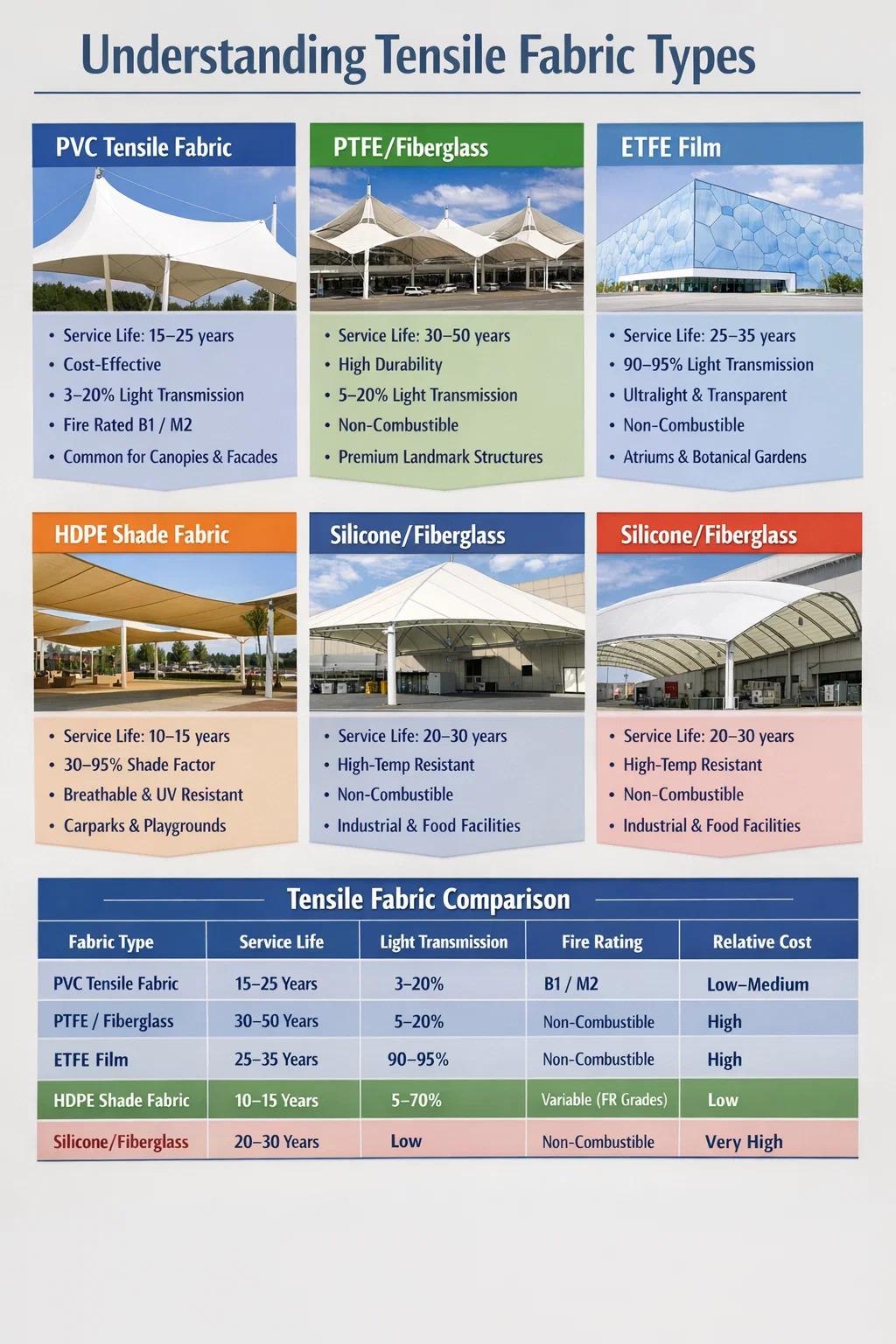 Les tissus tendus se déclinent en plusieurs types distincts, chacun étant conçu pour répondre à des exigences de performances spécifiques. Les principales catégories sont Tissu tendu en PVC, tissu PTFE (polytétrafluoroéthylène), film ETFE (éthylène tétrafluoroéthylène), tissu d'ombrage HDPE et fibre de verre enduite de silicone . Parmi ceux-ci, le tissu tendu en PVC domine le marché mondial – représentant environ 60 à 70 % de toutes les installations de membranes architecturales – en raison de sa rentabilité, de sa large gamme de couleurs et de ses performances structurelles fiables dans divers climats. Comprendre chaque type est essentiel avant de s'engager dans un projet de structure tendue, qu'il s'agisse d'un auvent, d'un toit de stade ou d'une façade à membrane à longue portée.