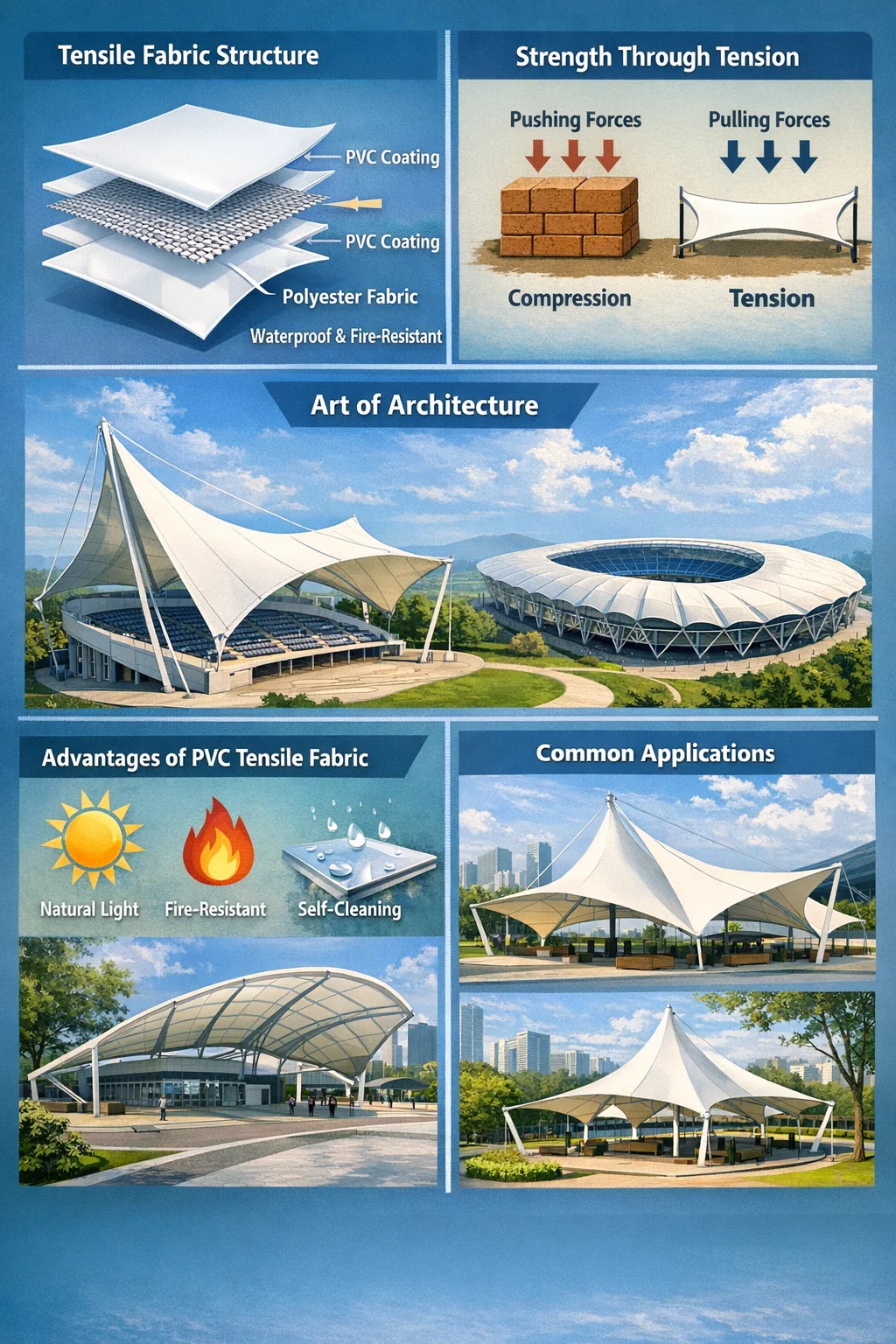 Le tissu tendu est un type spécial de tissu flexible qui est « capable de supporter des contraintes et du poids ». Contrairement aux vêtements ou aux rideaux ordinaires qui pendent librement, ils doivent être « tendus fermement » à l'aide de câbles en acier, de supports ou de pression d'air pour former une surface incurvée rigide mais légère.
