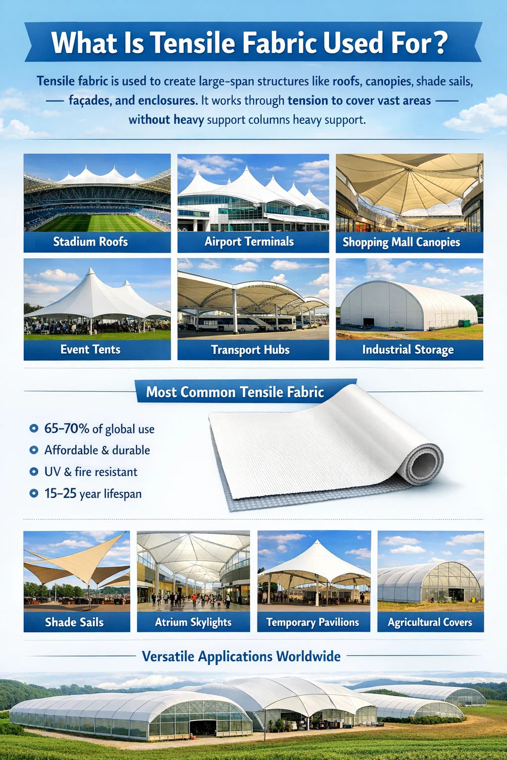 Le tissu tendu est utilisé pour créer des structures architecturales de grande portée (toits, auvents, voiles d'ombrage, façades et enceintes) qui allient résistance structurelle et flexibilité légère. Contrairement aux matériaux de toiture rigides conventionnels, le tissu tendu fonctionne en répartissant la charge par tension plutôt que par compression, ce qui signifie qu'il peut couvrir d'énormes zones sans colonnes de support lourdes ni charpente épaisse. Dans la pratique, vous trouverez des tissus tendus sur les stades sportifs, les terminaux d'aéroports, les auvents de centres commerciaux, les lieux d'événements en plein air, les parkings, les parcs à thème et même les passerelles de ponts dans le monde entier.